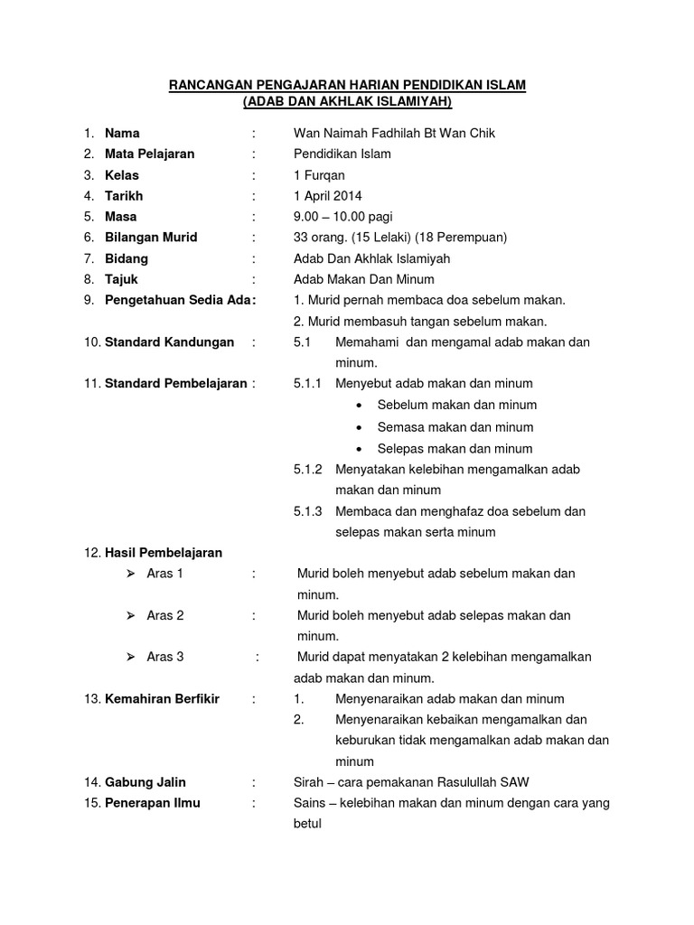 Menyebut pengertian adab makan dan minum setelah mendapat keterangan daripada guru. Guru bersoal jawab dengan murid. Up to 24 cash back Rancangan Pengajaran Harian Pendidikan Islam Tahun.