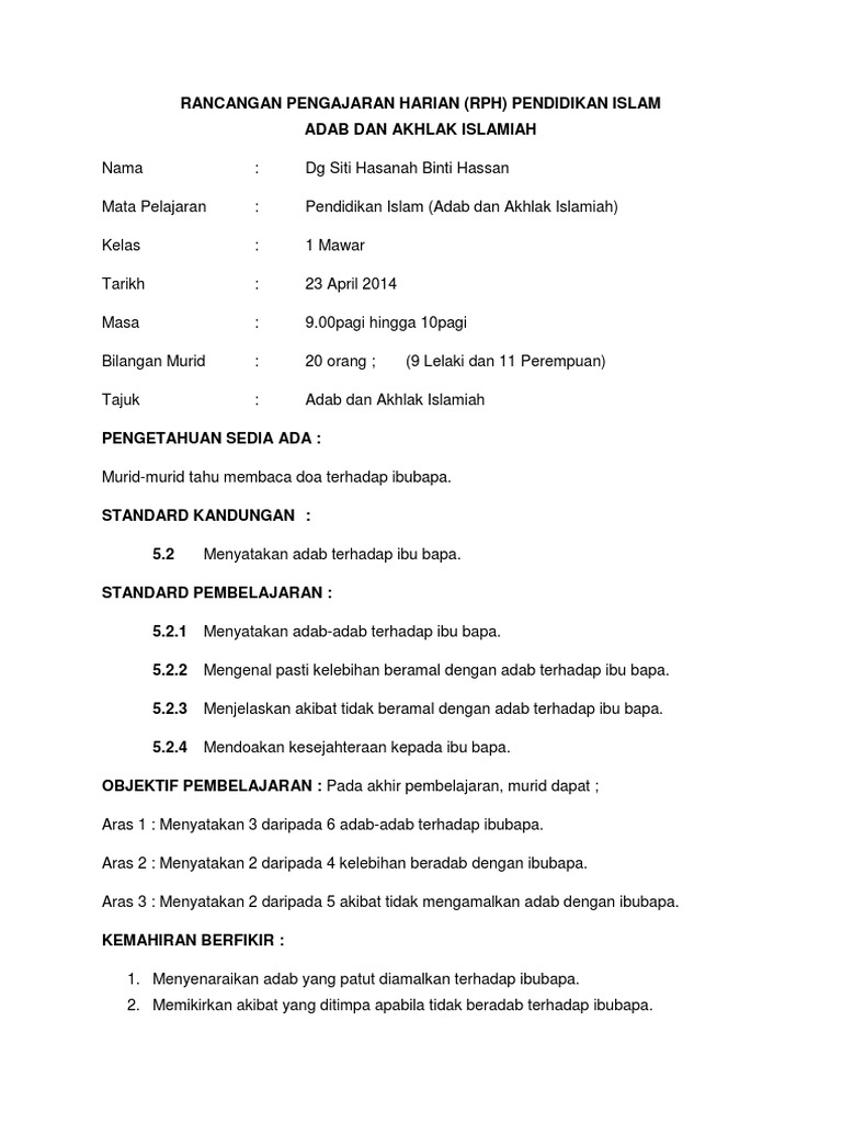 Melalui subjek Pendidikan Islam dirangka dengan tujuh bidang utama iaitu al-Quran Hadis Akidah Ibadah Sirah Adab dan Jawi. Berikut merupakan koleksi rph Pendidikan Islam tahun 5. Contoh Terkini RPH Pendidikan Islam.